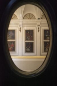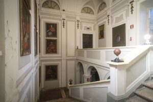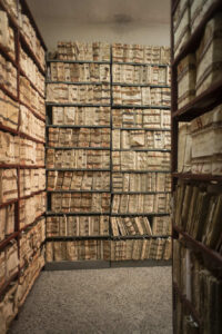 È stata proprio lei ad accompagnarci nella visita al Palazzo, che accoglie inoltre la Sala Bozzini, un ambiente spesso sede di iniziative culturali, conferenze e seminari, intitolato ad un’altra importante figura poliziana del secolo scorso: Lidio Bozzini. Questi fu un attivista politico, partigiano, editore, imprenditore in campo artistico, rappresentante all’estero della cultura italiana e dello spettacolo, protagonista della scena politica e istituzionale della Prima Repubblica, che mantenne sempre rapporti con Montepulciano e Siena. Per tale motivo, a 100 anni dalla sua nascita (2 febbraio 2022), la famiglia ha deciso di donare il suo archivio alla Biblioteca. Si tratta di una quantità importante di documenti risalenti per lo più agli anni della Resistenza e alla battaglia di Monticchiello, che rappresentano oggi una preziosa fonte di informazioni sull’organizzazione della lotta partigiana tra Valdichiana e Val d’Orcia.