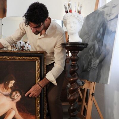 Fogli appesi con schizzi di figure, quasi a cercare le proporzioni giuste, pennelli e colori sistemati con cura . . .
