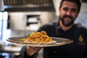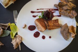 L’attenzione e la “coccola” ritornano dunque come must all’Enoteca Meucci, e non è un caso che sia segnalata sull’autorevole Guida Michelin già dal 2022, poco dopo l’apertura. Stavolta sono stata invitata anche ad assaggiare qualche prelibatezza dello chef Massimo Romano, professionista di grande esperienza, che ha lavorato con successo in Italia e all’estero, anche in realtà stellate. Massimo è maremmano e Mauro ci tiene a sottolineare che l’appellativo indica la sua provenienza, ma soprattutto la sua sostanza, come i piatti che fa. Pescatore, cacciatore, cercatore di funghi e tartufi, è cresciuto nel ristorante di famiglia e la sua è una cucina che guarda con attenzione alla tradizione toscana, strizzando però l’occhio anche all’innovazione e alla ricerca.
