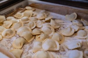 Ogni fase della lavorazione parla di artigianalità e attenzione al dettaglio. “Non usiamo prodotti pronti o industriali. Le carni vengono selezionate, cotte e porzionate, le verdure scelte fresche e lavorate in casa, le ricotte provengono da piccoli caseifici locali. Tutto questo richiede tempo, mani e dedizione, ma il risultato è un prodotto genuino e saporito, diverso da qualsiasi alternativa industriale”, spiega Massimiliano. I due laboratori convivono in equilibrio tra tradizione e tecnologia. A Sant’Anna, il profumo delle carni arrostite anticipa il carattere dei ripieni; a San Concordio, la pasta prende forma: sottile, morbida e luminosa, pronta ad accogliere combinazioni classiche e creative. I macchinari vengono utilizzati con rispetto, senza stressare l’impasto, riproducendo quasi l’effetto del “fatto a mano” e garantendo qualità costante anche nelle lavorazioni più complesse.