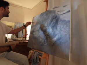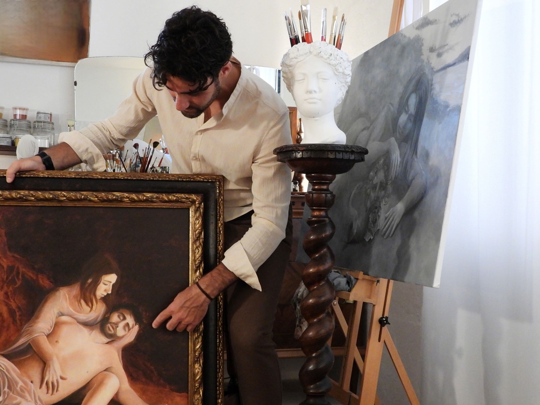 Quando mi avvicino al quadro appoggiato a terra, con le luci gialle delle lampade che creano ancora più atmosfera, vedo lui tra le braccia di lei, come se avesse finalmente trovato la pace. E ora? Cosa ti aspetti da questo nuovo percorso? “Beh, spero davvero di riuscire a farmi conoscere nel mondo dell’arte. Ho avuto la fortuna di incontrare il maestro Ulisse Sartini, uno dei grandi artisti contemporanei che si ispirano all’arte rinascimentale. Per me è sempre stato un punto di riferimento enorme e una grande fonte di ispirazione. Mi piacerebbe seguire le sue orme e soprattutto essere riconosciuto come artista. Ma ho ancora tanto da dare: tante idee nella testa che diventano schizzi. Tra queste c’è anche il progetto di una tela molto grande, due metri per due metri e mezzo, che sarà il mio primo lavoro con più figure. Una vera sfida con me stesso per approfondire lo studio delle pose e dell’anatomia… ma non voglio svelare troppo! Sarà comunque un viaggio introspettivo più complesso, dove voglio mettermi alla prova continuando a studiare e sperimentare”.