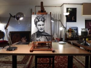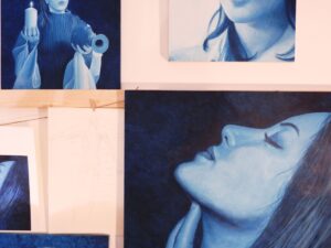 Nel suo studio e nella galleria a Gubbio puoi vedere tanti volti di donna appesi alle pareti: tele grandi affiancate da altre più piccole sui cavalletti; il blu si mescola tra mille sfumature e pose sempre diverse.  Ho notato molti tuoi ritratti femminili della fase blu, hai partecipato a mostre o eventi in quel periodo? “Sì, ho preso parte a diverse collettive tra il 2022 e il 2023 qui a Gubbio, ma anche al Must di Lecce e a Cesenatico, dove ho ricevuto un riconoscimento internazionale al “Premio Leonardo da Vinci”. Ho esposto a Palermo e in alcune gallerie di Roma. Dopo quel premio si sono aperte nuove opportunità per me: ho organizzato la mia prima mostra personale al Relais San Clemente di Bosco vicino Perugia, poi altre due mostre: una a Rimini e l’ultima personale, forse la più importante, alla Rocca di Passignano sul Trasimeno dove ho presentato tutto il mio percorso con l’acrilico”.