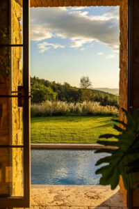 The central element of the intervention is the swimming pool, conceived as a blade of water that laps the historic building, establishing a direct dialogue between architecture and reflective surface. The basin, with a linear shape and infinity edges, discreetly approaches the stone masonry of the farmhouse, emphasizing its materiality and proportions through the play of relationships with the built.